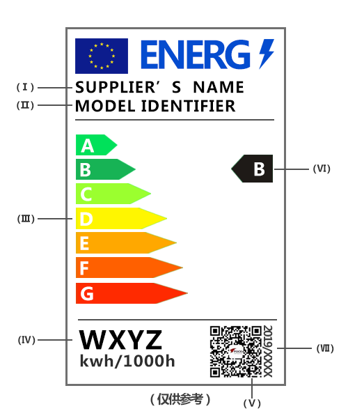 新標簽使用從A(最高效)到G(最不高效)的等級,取代從A ++(效率最高)到E(效率最低)的能效等級。提供有關能耗的信息,以每1000小時kWh表示。