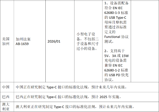 沙特阿拉伯、美國(guó)加州、印度等國(guó)家和地區(qū)也已出臺(tái)相關(guān)法律法規(guī),明確實(shí)施時(shí)間和要求。各國(guó)對(duì)Type-C充電器的法規(guī)要求整理如下:
