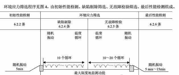 篩選過程中應(yīng)對(duì)產(chǎn)品的功能和性能進(jìn)行監(jiān)測(cè),在最長 20個(gè)循環(huán)內(nèi)只要連續(xù)10個(gè)循環(huán)不出現(xiàn)故障,產(chǎn)品即通過了溫度循環(huán)篩選;在最長15min內(nèi)連續(xù) 5min不出現(xiàn)故障,產(chǎn)品即通過了隨機(jī)振動(dòng)篩選。