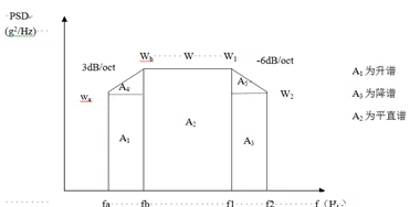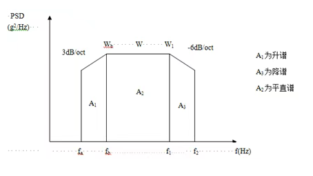 為了簡便起見,往往將功率譜密度曲線圖劃分成若干矩形和三角形,并利用上升斜率(如3dB/oct)和下降斜率(如-6dB/oct)分別算出wa 和w2,然后求各個幾何形狀的面積與面積和,再開方求出加速度總均方根值。