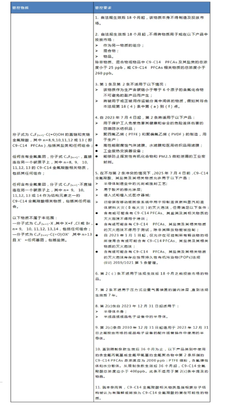 2020年8月3日,歐盟向WTO提交通報 G/ TBT/ N/EU/ 731,擬在歐盟REACH法規(guī)((EC) No 1907/2006)附錄XVII中限制C9-C14 PFCAs。該法規(guī)草案正接受公眾咨詢,咨詢期為通報發(fā)出后60天。該法規(guī)預計于2021年一季度被采納,在歐盟官方公報上發(fā)布20天后生效。相關限制要求于法規(guī)生效18個月后實施。