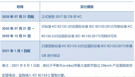 鋰電池產品的韓國KC認證可以接受CB報告及證書轉證,2020年12月31日前IEC 62133:2012版和IEC 62133:2017版的CB報告及證書(CB報告及證書需額外增加KC 62133-2國家差異的評估)均可以被接受用于KC轉證。2021年1月1日起只接受新標準KC 62133-2進行轉證。具體時間安排如下: