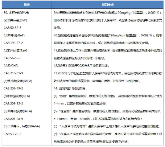 2021年7月21日,歐盟在其官方公報發布新法規(EU) 2021/1199,修訂歐盟REACH法規((EC) No 1907/2006)附件XVII第50條目,新增在人造草坪、操場或運動場地中用作填充物的顆粒或覆蓋物中多環芳烴(PAHs)的限制。該新法規將于歐盟官方公報發布后第20天生效。