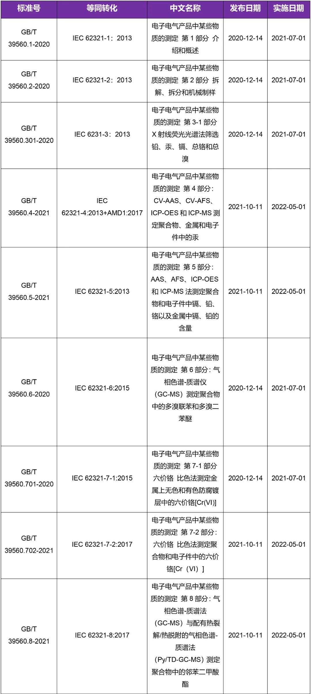 隨著電子電氣領(lǐng)域環(huán)保法規(guī)的加強(qiáng),更多有害物質(zhì)種類被限制使用,同時(shí)也出現(xiàn)更先進(jìn)快速的新型檢測(cè)技術(shù),而目前國(guó)內(nèi)電子電氣產(chǎn)品RoHS檢測(cè)標(biāo)準(zhǔn)GB/T 26125:2011是等同采用IEC62321:2008(此標(biāo)準(zhǔn)已經(jīng)按檢測(cè)技術(shù)和限制物質(zhì)種類修訂并發(fā)布了9個(gè)系列標(biāo)準(zhǔn))。因此,GB/T 39560系列標(biāo)準(zhǔn)應(yīng)運(yùn)而生,有望替代GB/T 26125成為我國(guó)《電器電子產(chǎn)品有害物質(zhì)使用管理辦法》配套使用標(biāo)準(zhǔn)!