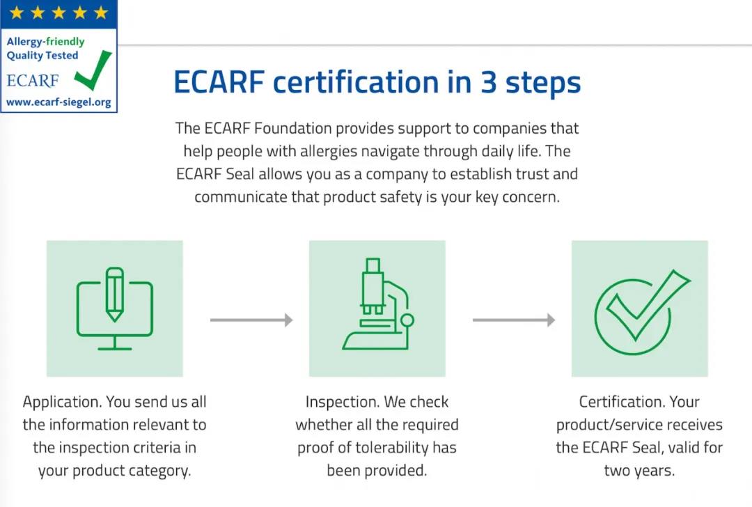 頒發(fā)的ECARF質(zhì)量標(biāo)志的防過敏產(chǎn)品,需符合嚴(yán)格的檢測標(biāo)準(zhǔn)。為了獲得認(rèn)證,制造商必須披露所有的原材料和配方。
