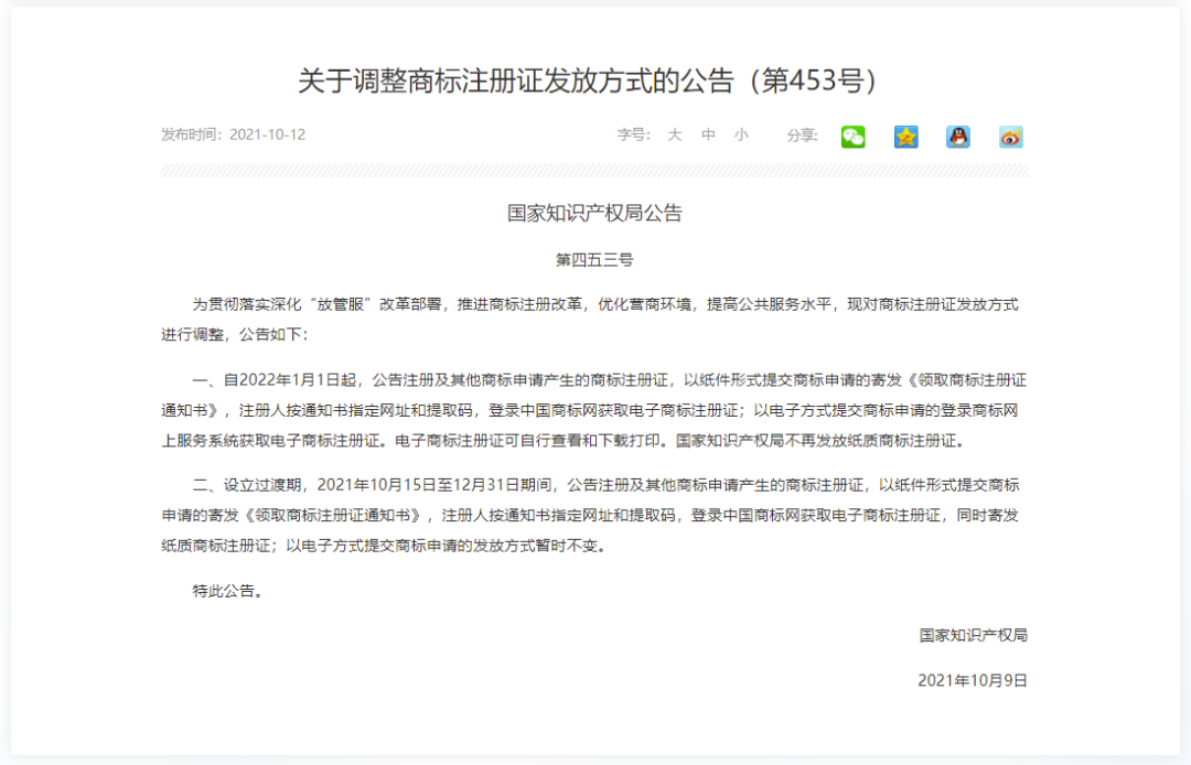 紙質商標證將從2022年1月1日起告別市場 據此前國家知識產權在官方網站發布的第453號公告顯示,自2021年1月1日起,國家知識產權局不再發放紙質商標注冊證,電子版商標注冊證將代替紙質化證書。過渡期為2021年10月15日至12月31日期間。