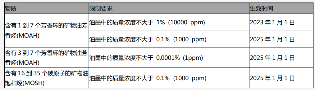 (2)在每個截止日期前制造或進(jìn)口的紙質(zhì)包裝和印刷品,如果符合在這些截止日期之前的含量要求,將有自這些截止日期起12個月的庫存處理期。就本法令而言,礦物油是指從用于制造油墨的石油烴衍生的原料生產(chǎn)的油。礦物油作為復(fù)雜的碳?xì)浠衔铮饕ㄖ辨湣⒅ф溚闊N和烷基取代的環(huán)烷烴(MOSH)以及烷基取代的芳香烴(MOAH)兩大類。通過飲食攝入人體內(nèi)的礦物油易在人體內(nèi)發(fā)生集聚,給人體健康帶來巨大的損害。2017年10月27日,世界衛(wèi)生組織國際癌癥研究機(jī)構(gòu)公布的致癌物清單中,將未經(jīng)處理或輕度處理的礦物油列入1類致癌物清單,礦物油、高精煉油在3類致癌物清單